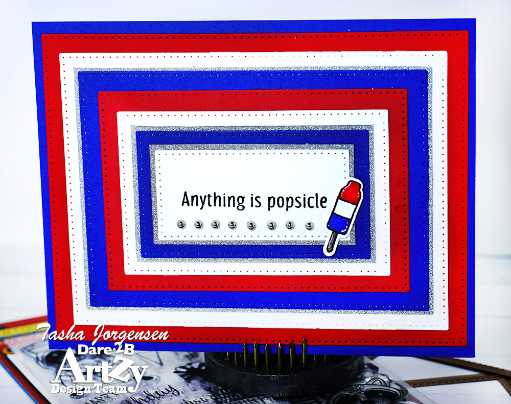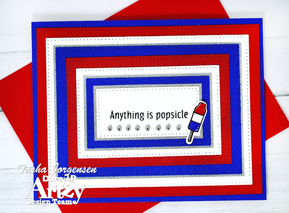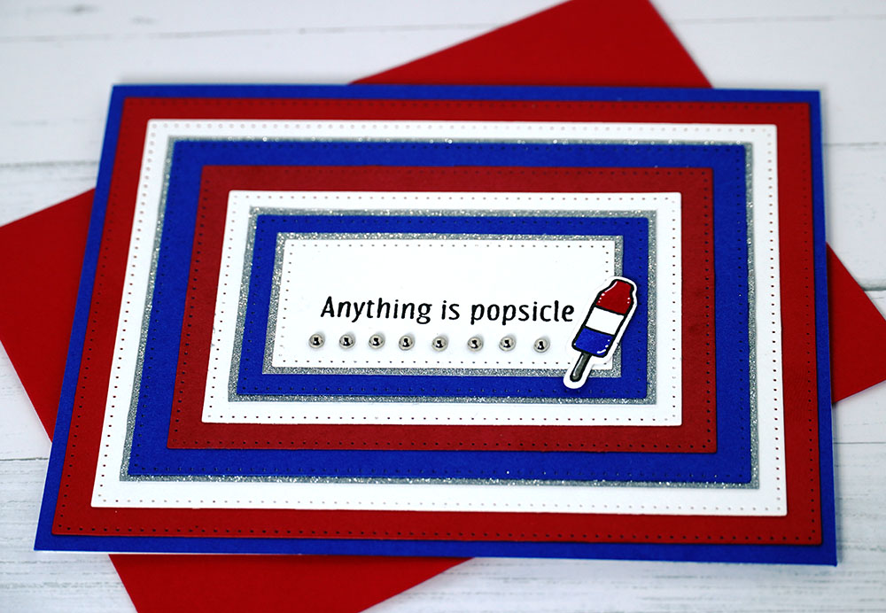 Since it’s officially Summer, I decided to go with a Red, White & Blue theme inspired by the Bomb Pop! I used to love these when I was younger! For the layers, I used the new Rectangle Framelits Die Set. These layers have a nice pierced border and make layering so easy!