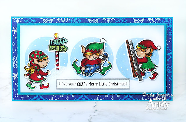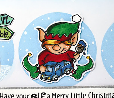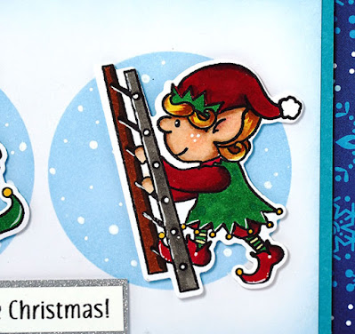 I used a simple circle stencil to add ink to the background. I used the same blue ink around the edges of the center card and used a white gel pen to add snow details. I think the falling snow looks great behind these happy elves!