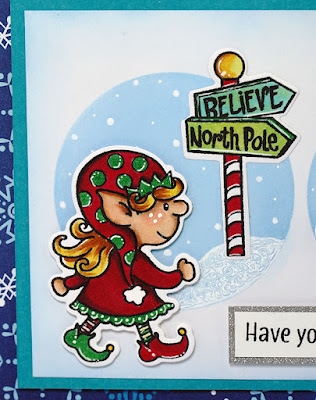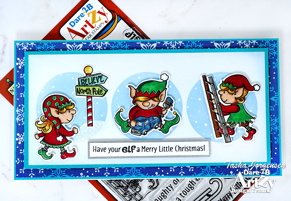 All of the cute Elf images were stamped with Totally Black Ink and colored with Copic Markers. I used the coordinating die set to easily cut the images out. I love that this set includes several characters, accessories and sentiments to really allow you to customize your card.
