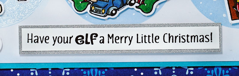 The sentiment “Have your Elf a merry little Christmas” was also stamped with Totally Black Ink, but I matted the greeting on silver glitter paper for sparkle. There is so much happening on the front of the card, I thought the simple sentiment was perfect!