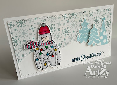 This tangled-up-in-lights yeti is from the Yeti 4 Winter stamps and dies set. The icy blue trees are from the Deck the Halls and Joy to the World stamps and dies sets.