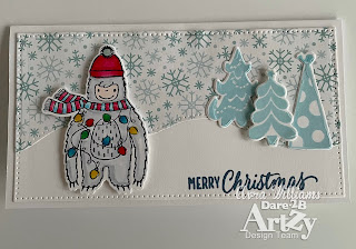 I then stamped Merry Christmas with a stamp from the Toboggan Fun stamp set, and adhered my card front onto a mini slimline size card base. I added my yeti and trees to complete this wintery holiday card.