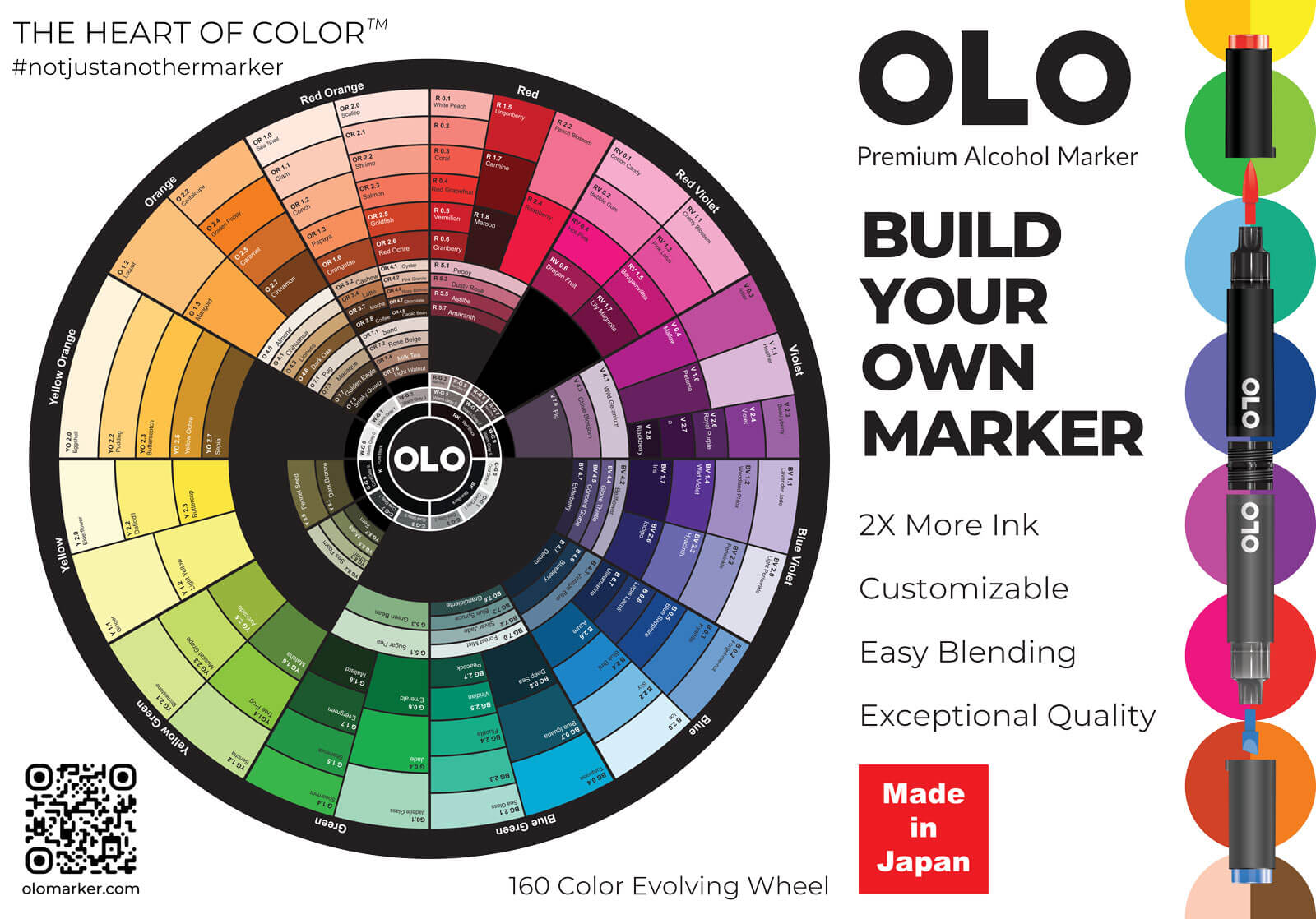 OLO is a marker brand built by industry veterans with over 20 years of experience, offering innovative, high-quality alcohol markers designed to perform better than traditional markers. Their patented free-flow ink system and modular design let artists customize markers with replaceable ink cartridges and nibs, delivering more usable ink, smooth consistent flow, and vibrant color options. Made in Japan and supported worldwide, OLO markers aim to give creators a more efficient, enjoyable coloring experience with a broad, thoughtfully organized color palette.