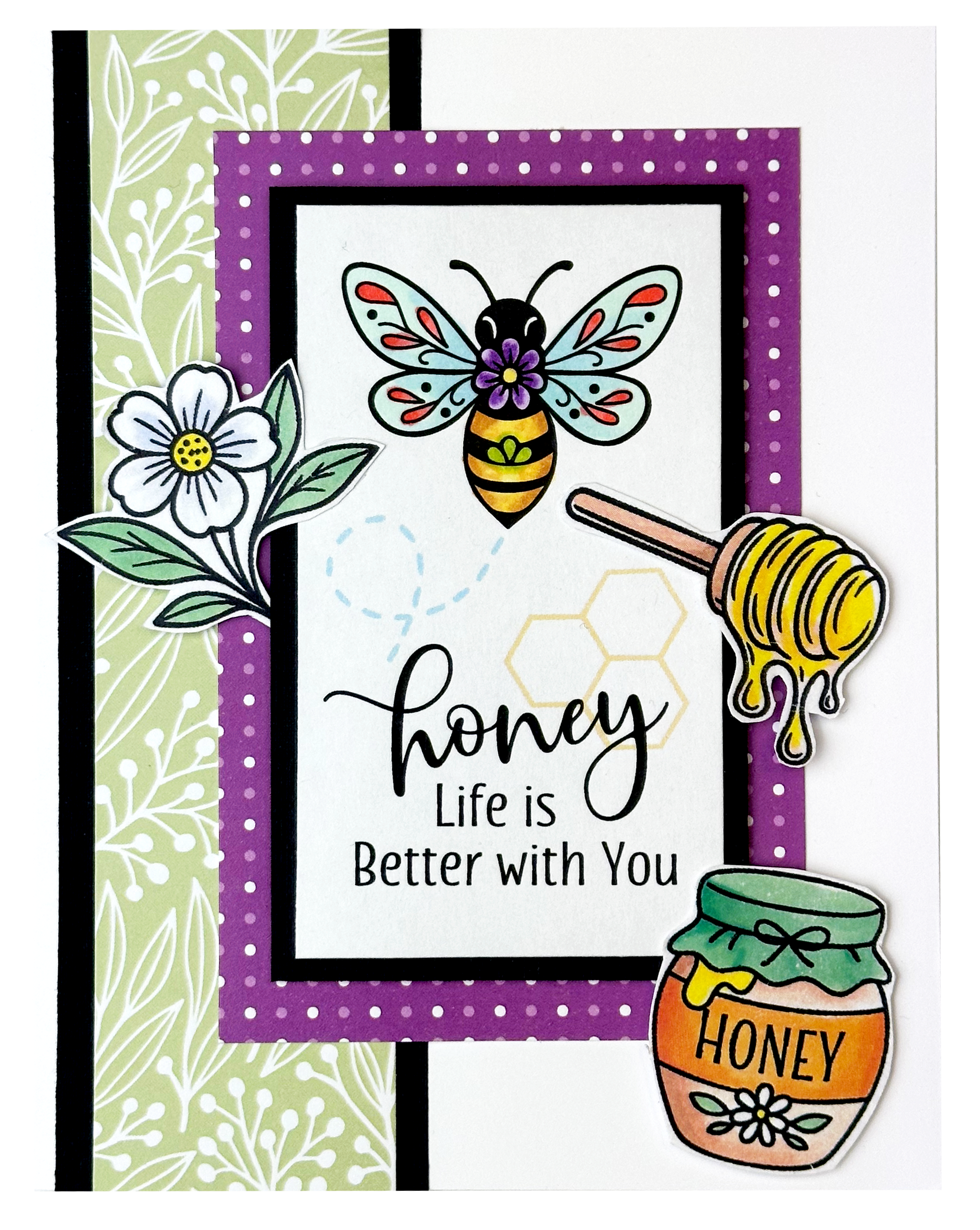 Add a little buzz to your crafting with the Sweet as Honey stamp set! This playful set includes three adorable bees, a honey pot, flowers, honey dipper, honeycomb graphics, and encouraging sentiments like “Bee-lieve in yourself,” “You’re sweet, honey,” “Buzzing by with a Big Hello,” "Bee Loved, Bee You" and “Life is better with you.”
